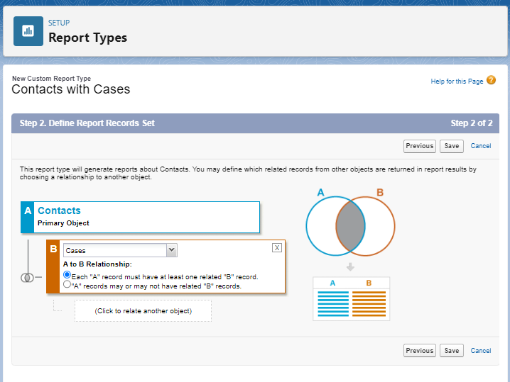 이전 화면에서 선택한 Primary Object가 있고 (Click to relate another object) 버튼을 눌러서 해당 Primary Object와 관계가 있는 오브젝트를 선택할 수 있습니다. 두 오브젝트 사이 관계의 타입에 대해서는 Primary Object를 기준으로 Inner Join 또는 Left Outer Join을 선택할 수있습니다. 각 옵션에 대해 벤다이어그램으로 시각적으로 나타내 주므로 선택에 참고할 수 있습니다.