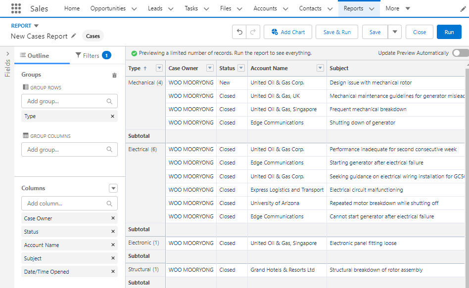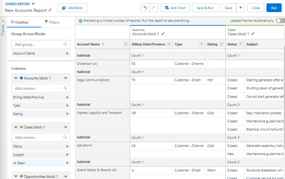 이후 세 오브젝트가 모두 공통으로 갖고있는 Account Name 필드를 기준으로 그룹화하면 각 Account별로 관련된 Case와 Opportunity들을 집계하여 볼 수 있습니다.