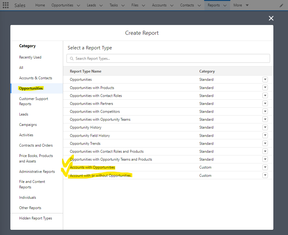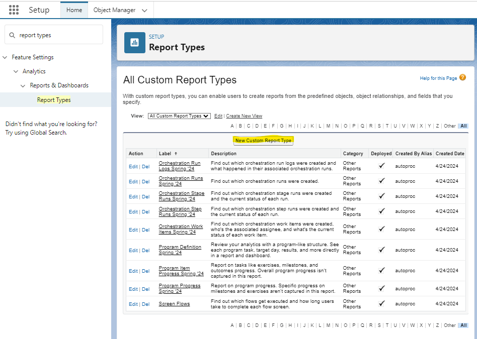 Quick Find에서 Report Types를 검색한뒤 New Custom Report Type 버튼을 통해 커스텀 리포트 타입을 생성할 수 있습니다.