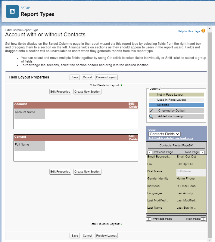 Fields Available for Reports 영역에서 Edit Layout을 클릭하면 해당 타입의 보고서를 만들때 포함할 필드들을 선택할 수 있습니다.