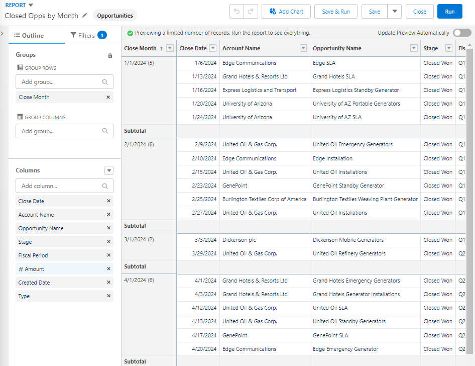 매트릭스(Matrix): 매트릭스 리포트는 서머리 리포트와 매우 유사하지만, 행과 열 모두에 대해 그룹화하여 다양한 총계를 볼 수 있게 합니다. 위의 예를 계속해서, 계정별로, 월별로 기회의 가치를 보고 싶다면, Edge Communications가 1월에 $100,000, 2월에 $50,000의 기회를 가지고 있는 것을 볼 수 있습니다.