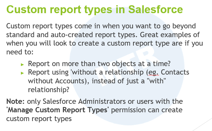 사용자 정의 보고서 유형을 만들기 위해서는 Salesforce 관리자 권한이나 '사용자 정의 보고서 유형 관리(Manage Custom Report Types)' 권한이 필요합니다.