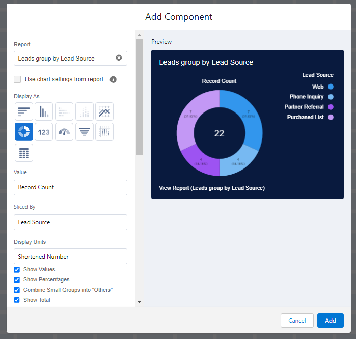 이후 컴포넌트의 타입을 파이차트로 선택하고 Add버튼을 눌러 대시보드에 추가 해줬습니다. 전체 리드중 각 리드 소스가 차지하는 비중을 한눈에 쉽게 파악할 수 있습니다.