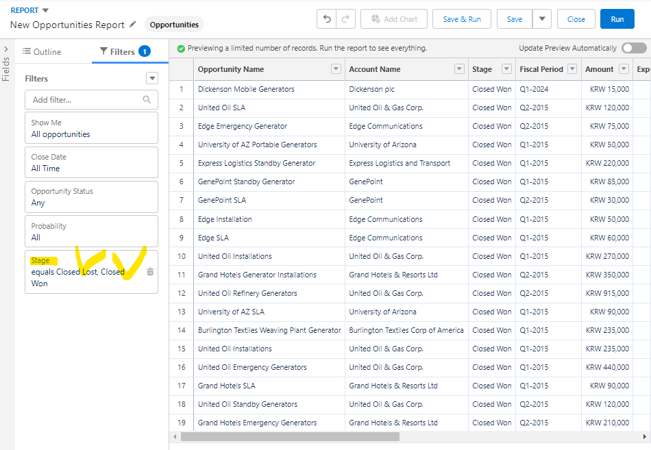 Filter에서 Stage 필드를 추가한뒤 Closed 상태의 값들을 적용하여 레코드들을 조회할 수 있습니다.