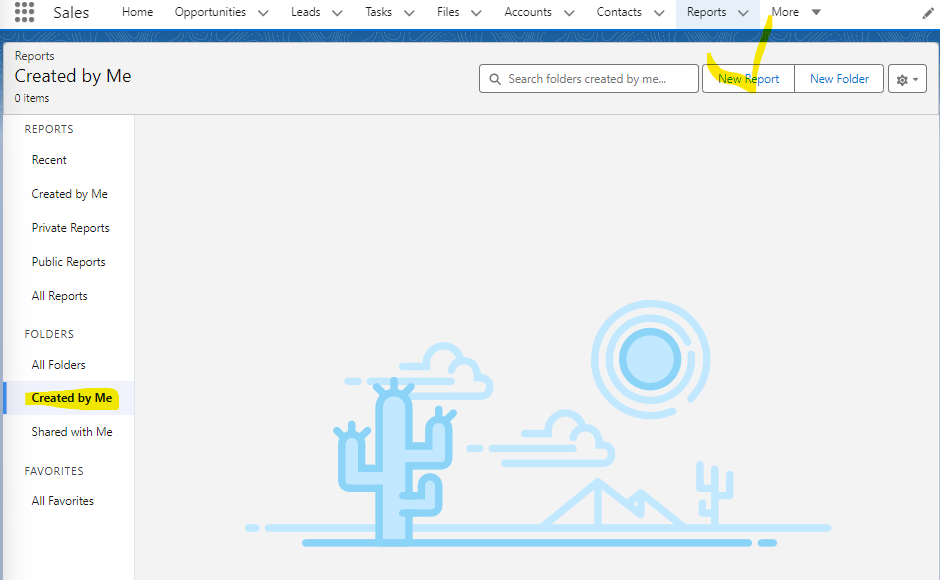 App launcher에서 reports를 검색해서 위와 같은 화면에 접근할 수 있습니다. Created by Me라는 폴더에서 New Report 버튼을 눌러 새로운 리포트를 생성해보겠습니다.