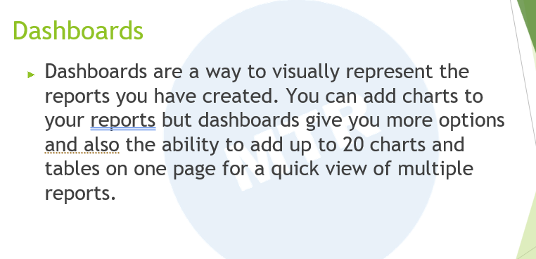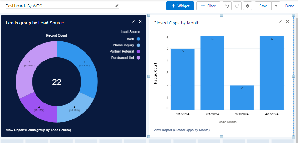 대시보드는 생성한 보고서를 시각적으로 표현하는 방법입니다. 보고서에 차트를 추가할 수 있지만, 대시보드는 더 많은 옵션을 제공하며, 한 페이지에 최대 20개의 차트와 테이블을 추가하여 여러 보고서를 빠르게 확인할 수 있습니다.