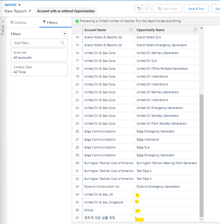 Accounts with or without Opportunities로 명명한 타입의 리포트를 생성하고 조회해보면 Opportunity 레코드가 없는 Account 레코드들까지 총 37개의 레코드가 포함된 것을 볼수 있습니다.