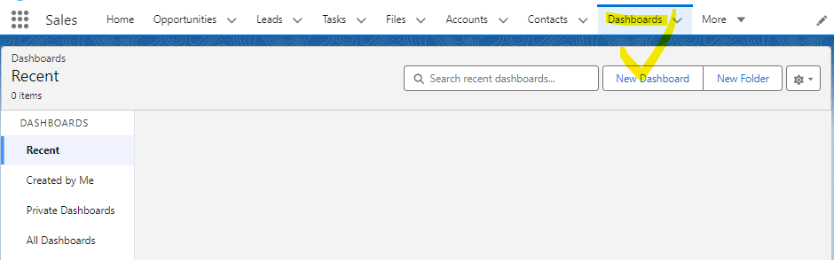 App Launcher에서 Dashboards를 검색한뒤 New Dashboard 버튼을 눌러 새로운 대시보드를 생성할 수 있습니다.