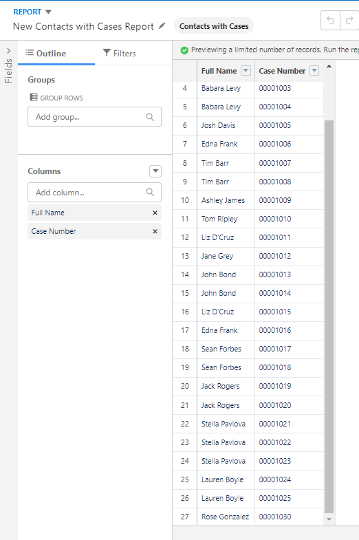 이후 조회되는 레코드들은 Case 정보가 존재하는 Contact들만 포함하는 것을 볼 수 있습니다.