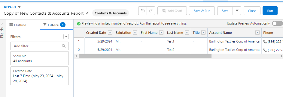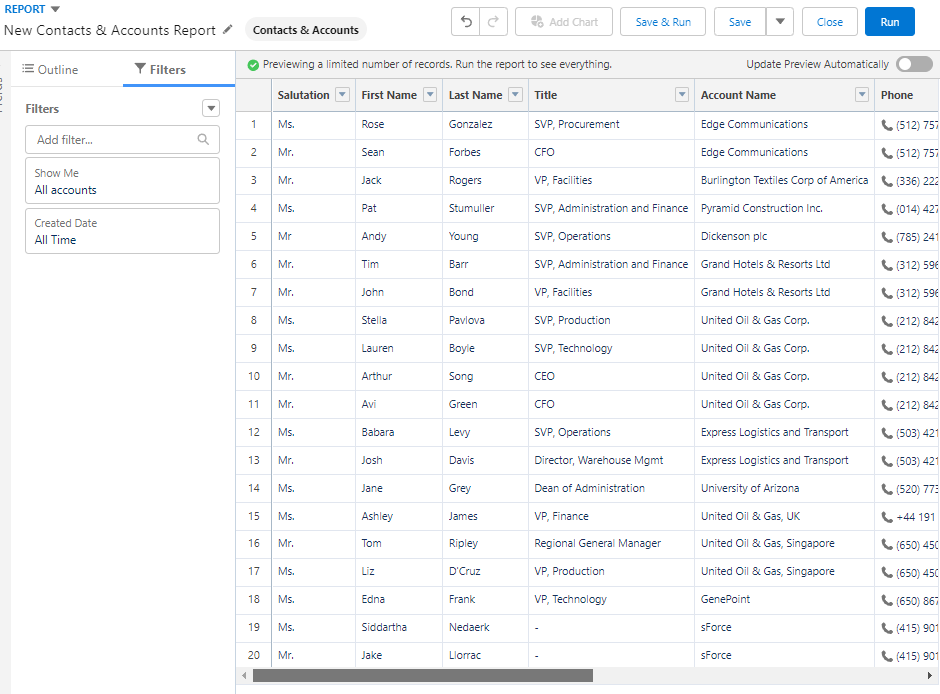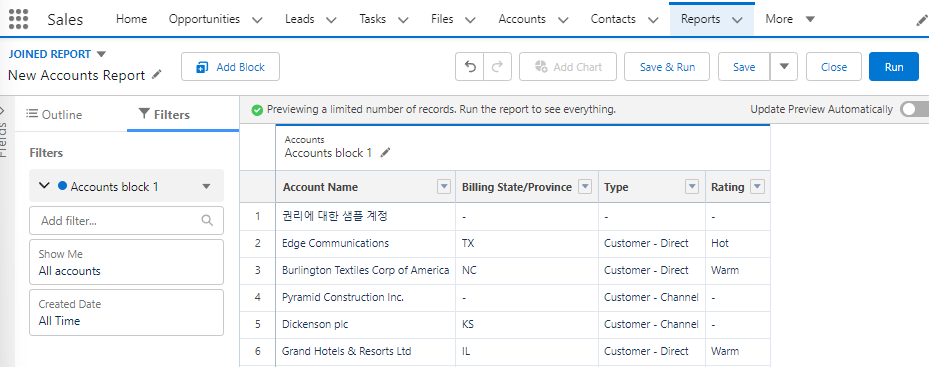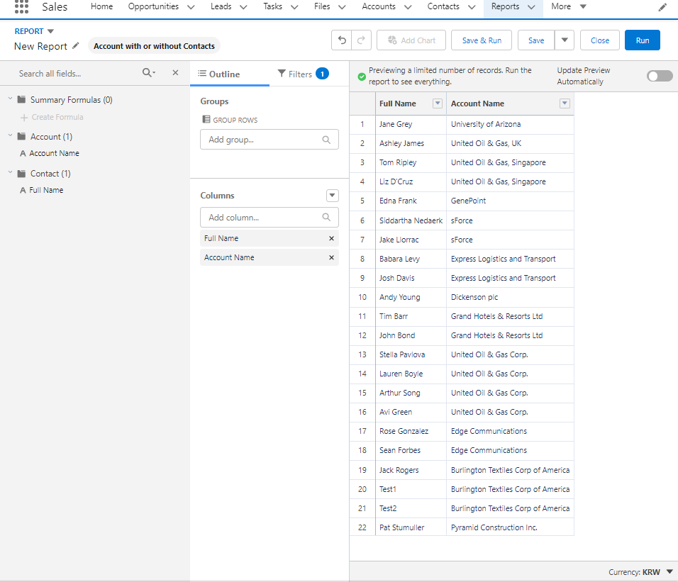 프리뷰에서 컨택트 레코드별로 어카운트 레코드 정보가 함께 조회되는 것을 볼 수 있습니다. 두개의 오브젝트를 조인해서함께 보여주기 때문에 Account 정보가 없는 Contact 레코드는 해당 레포트 타입에서 조회되지 않습니다.