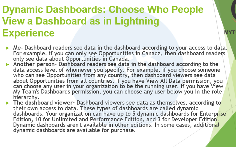 다이나믹 대시보드를 통해 Salesforce Lightning Experience에서 대시보드를 보는 사람이 누구인지에 따라 보이는 데이터를 동적으로 바꿀 수 있습니다. 이는 데이터 접근성을 맞춤화하고, 사용자별로 필요한 데이터를 정확하게 제공하는 데 매우 유용합니다.