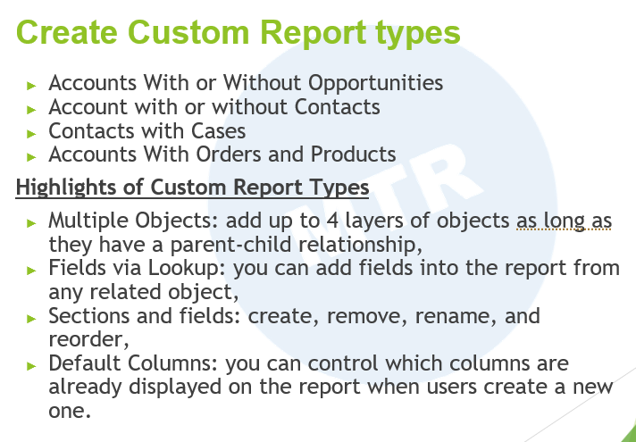 Salesforce에서 사용자 정의 보고서 유형은 표준 보고서 유형과 자동 생성된 보고서 유형을 넘어서고 싶을 때 유용합니다. 사용자 정의 보고서 유형을 생성하는 몇 가지 주요 사례는 다음과 같습니다: