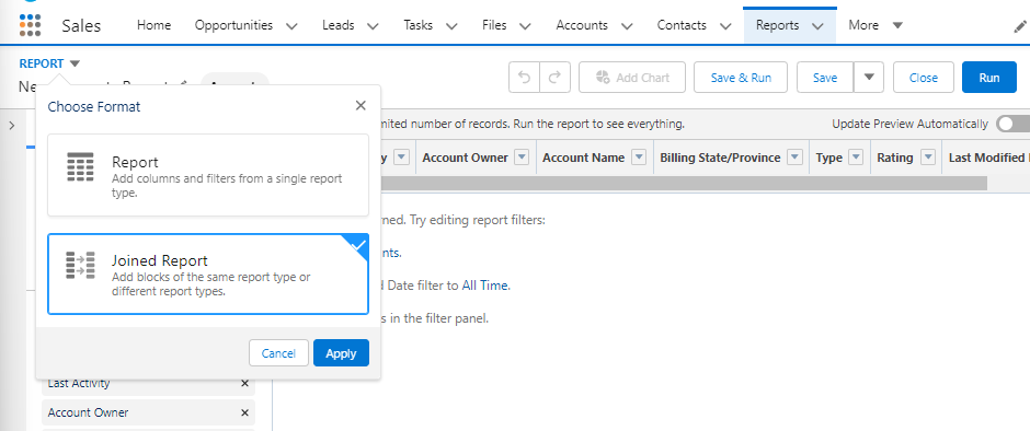 Account Type의 리포트를 생성하고 좌상단의 메뉴를 클릭해서 Joined Report 타입을 선택했습니다.