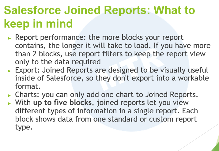 Salesforce의 Joined Reports를 사용할 때 다음과 같은 사항을 주의해야 합니다.