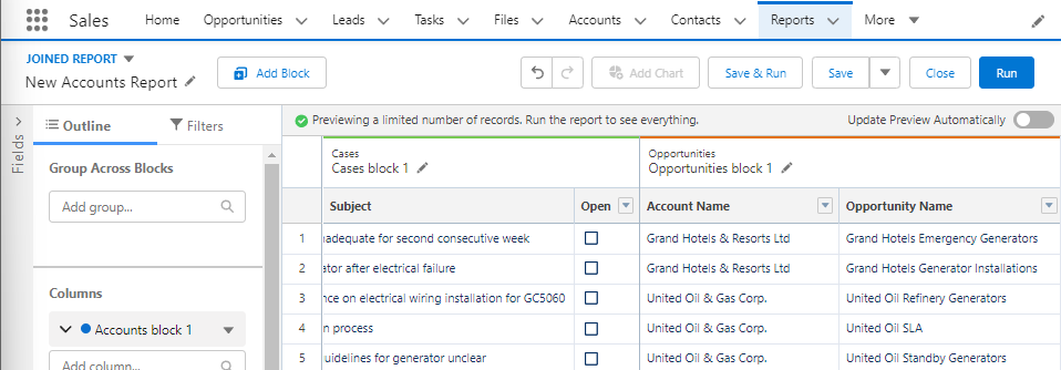 조인드(Joined Reports): 조인드 리포트를 사용하면 두 개의 별개의 리포트를 생성하여 데이터를 나란히 비교할 수 있습니다. 계정별로 기회와 사례의 총 수를 나란히 보여주는 조인드 리포트를 사용할 수 있습니다.