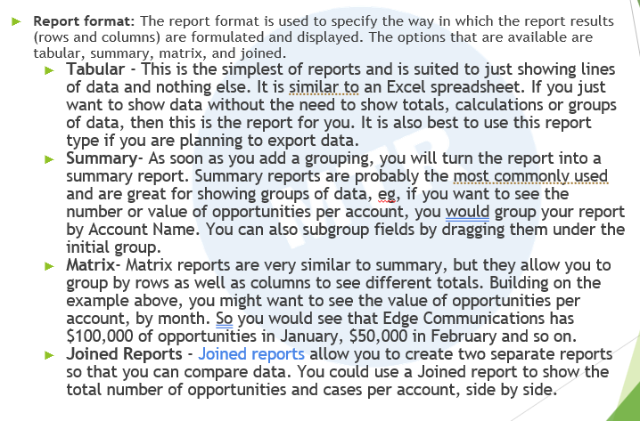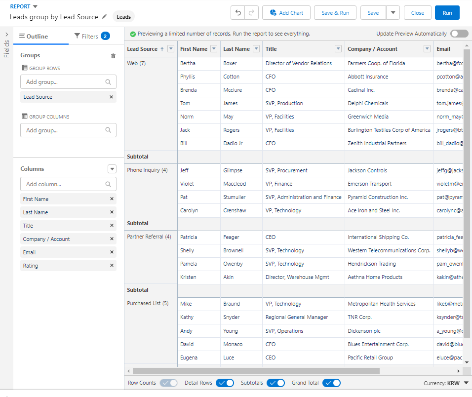 서머리(Summary): 그룹핑을 추가하는 순간, 리포트는 서머리 리포트로 전환됩니다. 서머리 리포트는 아마 가장 흔히 사용되며, 데이터 그룹을 보여주기에 좋습니다. 예를 들어, 계정별 기회의 수나 가치를 보고 싶다면, 리포트를 계정 이름별로 그룹화하게 됩니다. 초기 그룹 아래에 필드를 드래그하여 하위 그룹도 생성할 수 있습니다.