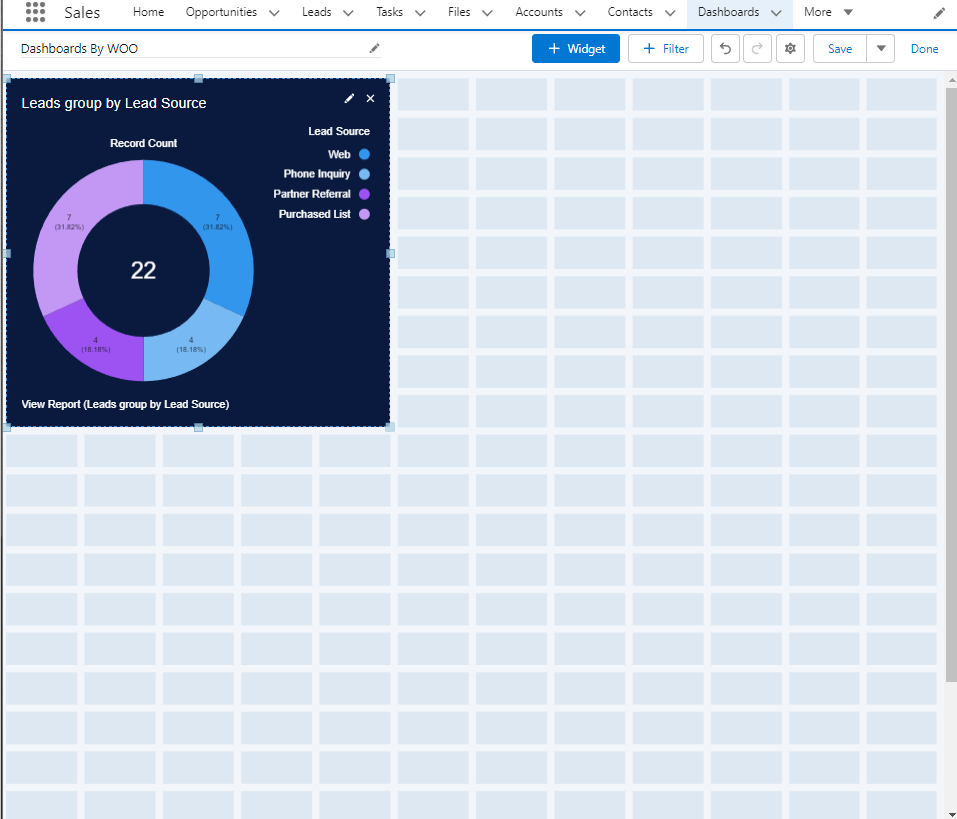 중요한 점은 데이터 소스로 사용될 리포트가 그룹화 기능을 사용하지 않으면 시각화를 위한 컴포넌트를 추가할 수 없습니다. 따라서 Lead Source 필드를 기준으로 그룹화 했습니다.