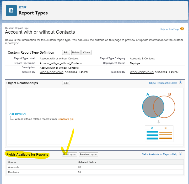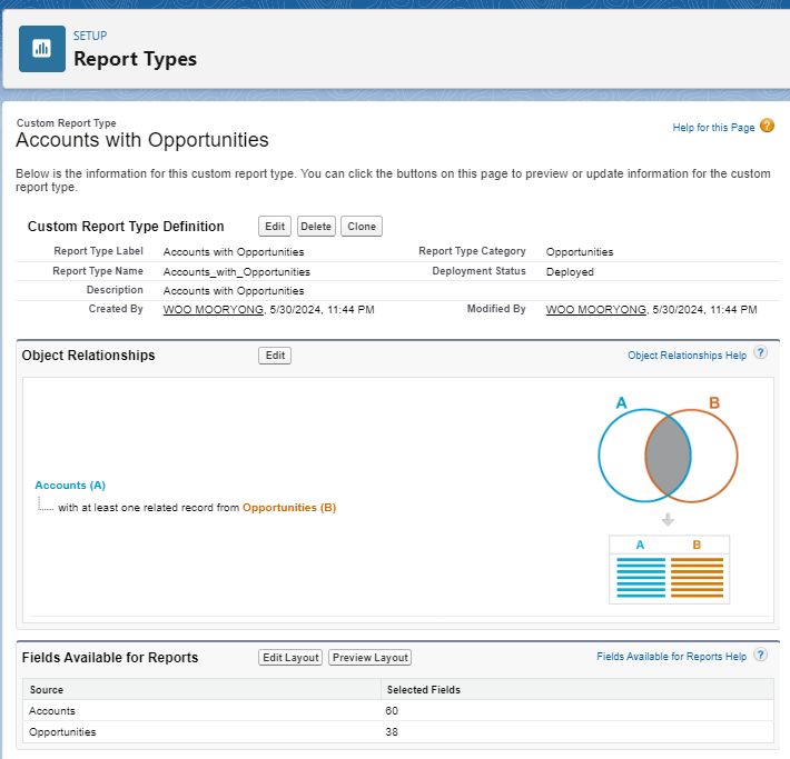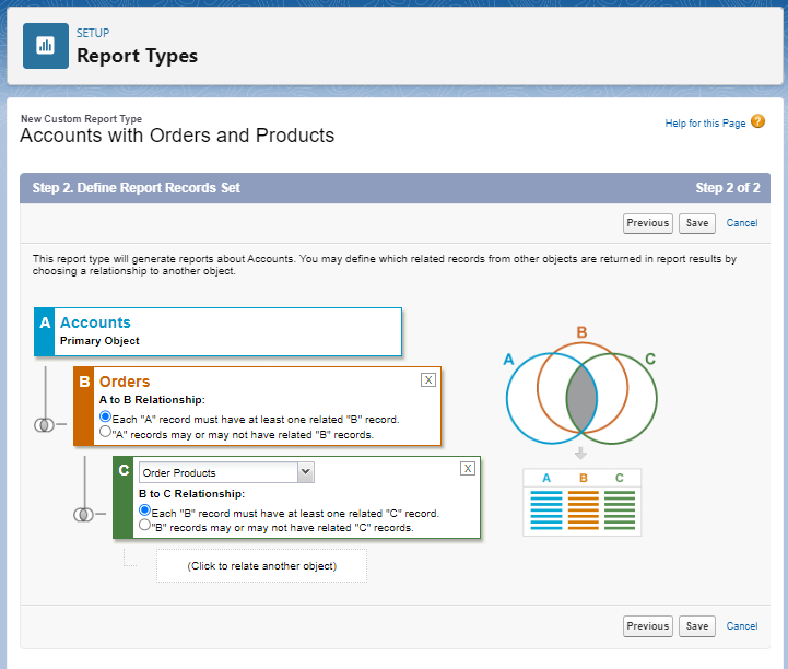 Accounts with Orders and Products은 Accounts 레코드와 연관된 Order 정보를 포함하고 또 해당 Order에 포함된 Product 정보를 포함해야하기에 위와 같이 정의하여 리포트 타입을 생성했습니다.