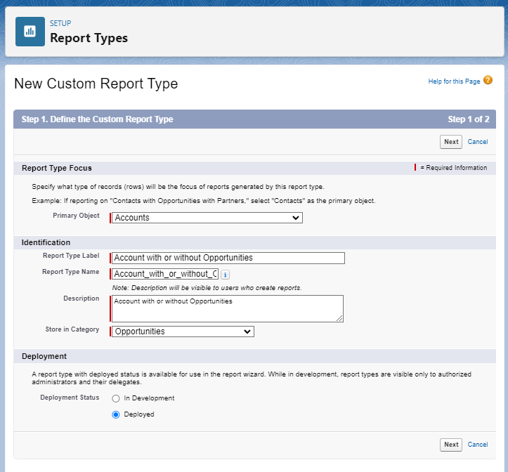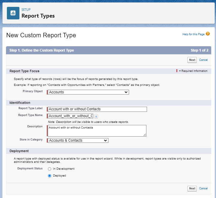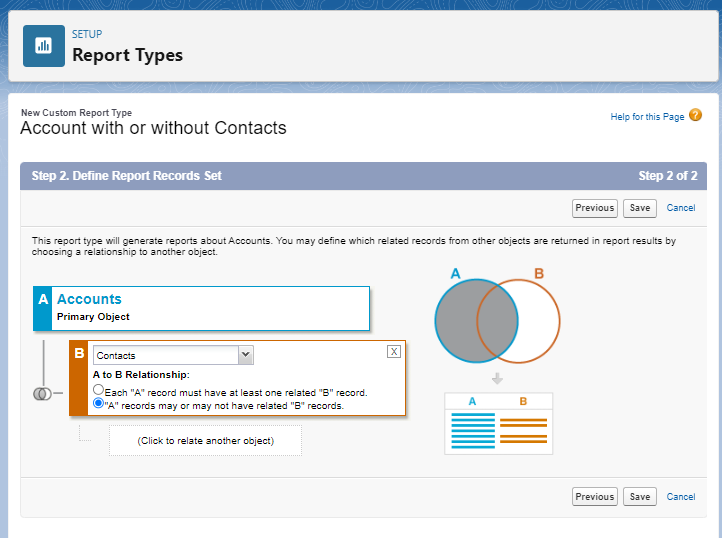 Accounts with or without Conatcts 요구사항을 위해 새로운 커스텀 리포트 타입을 생성했습니다.