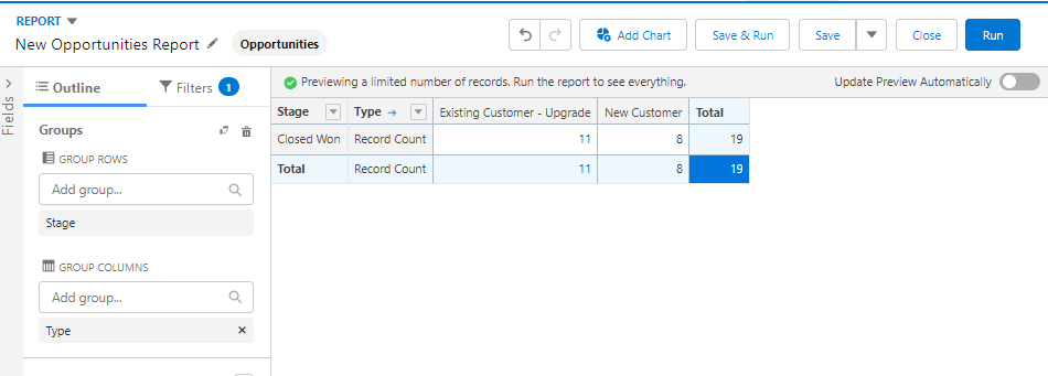 Outline 탭의 Groups 영역에서 GROUP ROWS 에 Stage 필드를 추가하고 GROUP COLUMNS를 추가하면 위와 같이 행 단위로도 그룹화하여 집계할 수 있고 칼럼단위로도 집계가 가능합니다. 이렇게 로우와 칼럼별로 모두 집계해서 볼수 있는 보고서가 Matrix Report 입니다.