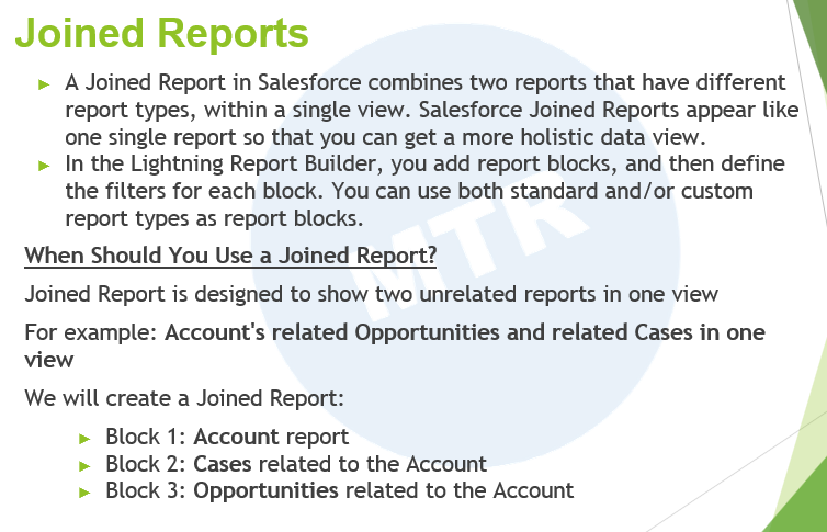Salesforce의 Joined Report는 서로 다른 보고서 유형을 하나의 보기로 결합한 것입니다. Joined Report는 하나의 보고서처럼 나타나므로 보다 전체적인 데이터 뷰를 제공할 수 있습니다. Lightning Report Builder에서 보고서 블록을 추가하고 각 블록에 대한 필터를 정의합니다. 표준 및/또는 사용자 정의 보고서 유형을 보고서 블록으로 사용할 수 있습니다.