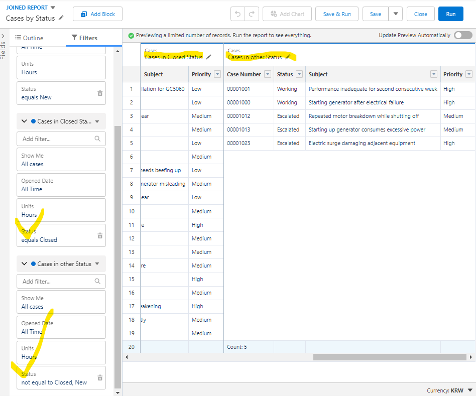 이후 두번째 블록과 세번쨰 블록을 추가해서 각각 Status가 Closed인 레코드, Status가 New or Closed가 아닌 레코들을 포함하도록 했습니다.