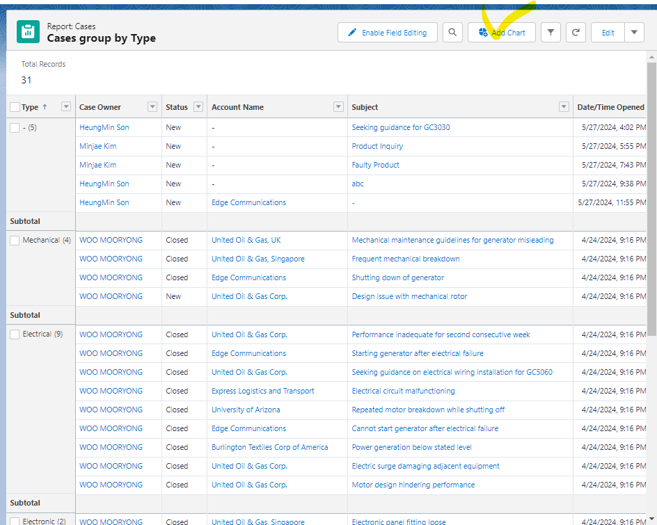 Save & Run 버튼을 눌러 저장하고 실행해보면 프리뷰에서 확인한대로 Type별로 그룹화된 것을 확인할 수 있고, Add Chart 버튼이 활성화 되어있습니다. 그룹핑을 추가하는 순간 리포트는 자동으로 Summary 타입으로 변경되기에 해당 버튼이 활성화 되었습니다.