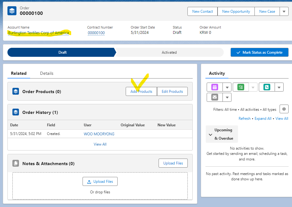 Burlington Textiles Corp of America Account의 Order를 하나 생성해도 Order Product가 존재하지 않기에 여전히 리포트에서 조회되는 내용은 없습니다. Add Product 버튼을 통해 주문제품을 추가해보겠습니다.