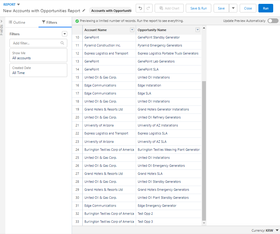 Accounts with Opportunities로 명명한 타입의 리포트는 Opportunity 값이 없는 레코드들은 제외하고 총 33개의 레코드만 포함하고 있습니다.