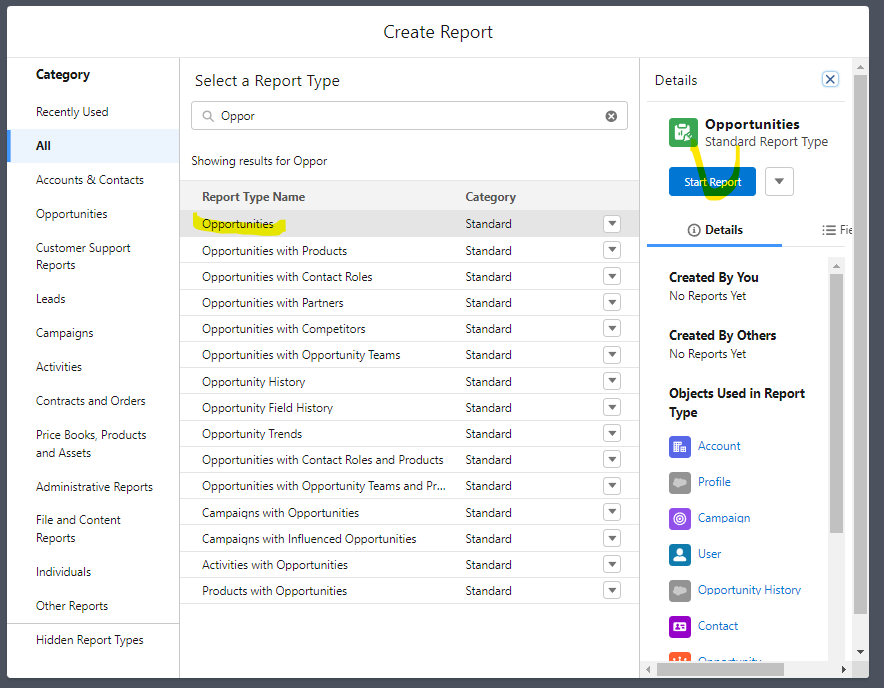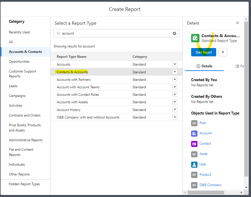 레포트 타입 중 Contacts & Accounts를 선택한뒤 Start Report를 클릭합니다.