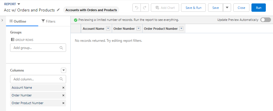 Order Product 2종을 추가하니 보고서에서 해당 Account의 Order 레코드와 Order Product 관련 레코드들을 조회할 수 있습니다.
