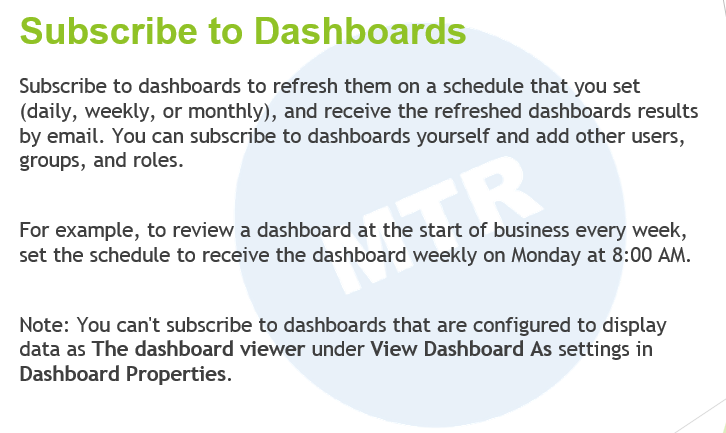 대시보드를 구독하여 설정한 일정(매일, 매주, 매월)에 따라 새로고침하고, 새로고침된 대시보드 결과를 이메일로 받을 수 있습니다. 자신뿐만 아니라 다른 사용자, 그룹, 역할을 대시보드에 구독시킬 수 있습니다.
