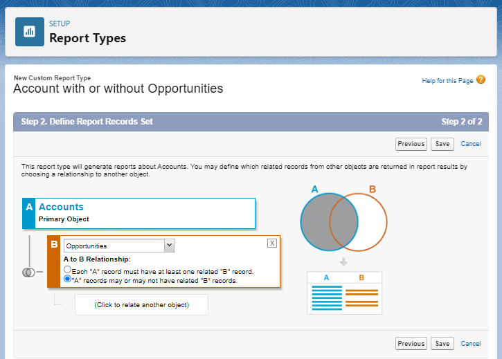 요구사항은 Opportunity 레코드가 있거나 없는 Account 레코드에 대해서 필요하므로 "A" records may or may not have related "B" records. 옵션을 선택하고 저장했습니다.