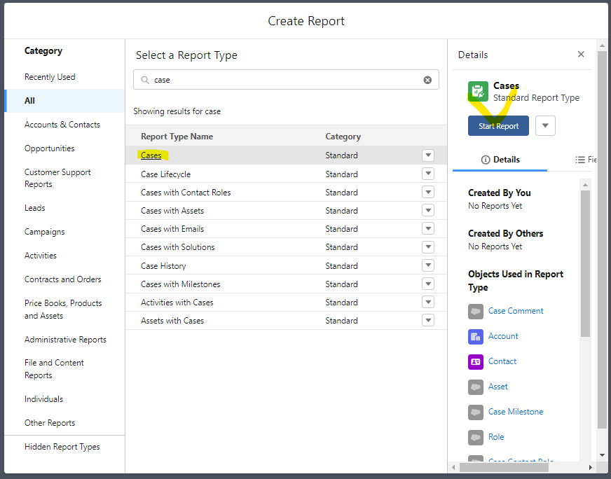 Cases와 연관된 레코드들만 리포트에 포함해야 하므로 위와 같이 옵션을 선택하고 저장했습니다.