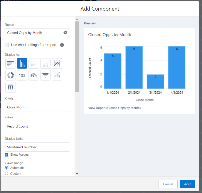 먼저 데이터 소스로 사용할 리포트를 위와 같이 생성해줬습니다. Closed Won 상태의 레코드만 포함하도록 하고, 시각화 컴포넌트 사용을 위해 Close Month를 기준으로 그룹화 했습니다.