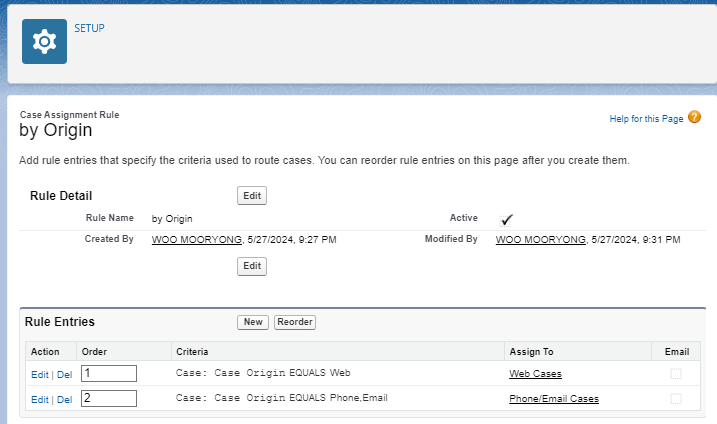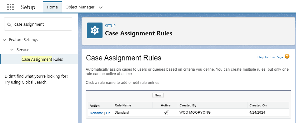 Quick Find에서 Case Assignment Rules에 접근해 New 버튼을 눌러 새로 생성할 수 있습니다. 기존에 정의된 표준 규칙이 있지만 새로 생성해보겠습니다.