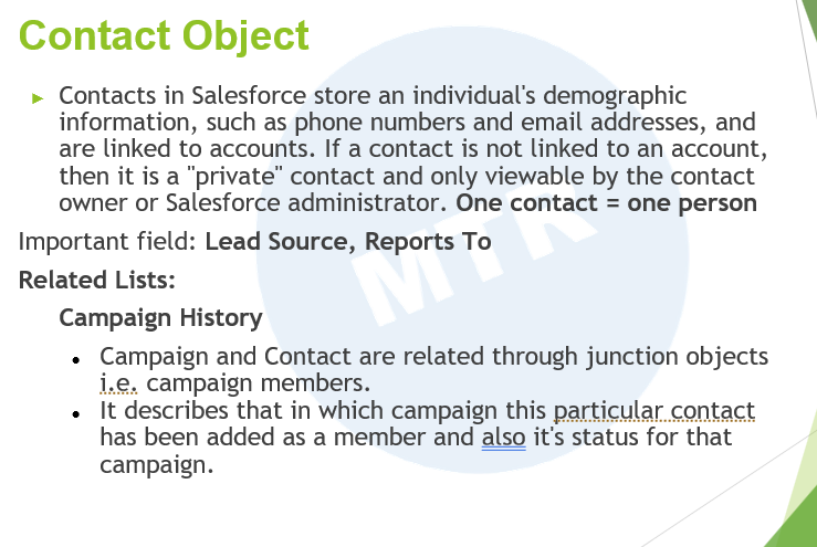 Salesforce의 Contact 객체는 개인의 인구 통계 정보(예: 전화번호 및 이메일 주소)를 저장하며, 계정에 연결됩니다. 계정에 연결되지 않은 Contact는 '개인' Contact로 간주되며, Contact 소유자나 Salesforce 관리자만 볼 수 있습니다. 한 Contact는 한 명의 개인에 해당합니다.