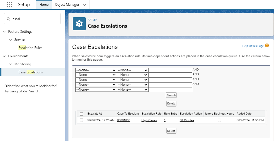 Case Escalations에서 위와 같이 에스컬레이션 대상인 목록을 조건에 따라 조회할 수 있습니다. 정의한 규칙에 따라 새로운 레코드가 에스컬레이션이 적용될 것을 확인할 수 있습니다.