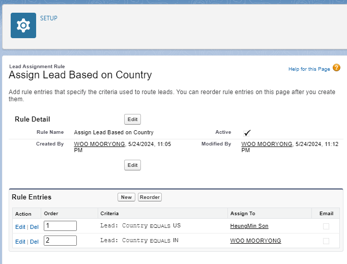 Lead Assignment Rule은 한번에 하나의 룰만 활성화 가능하기에 기존에 존재하던 Standard 룰은 자동으로 비활성화 되었습니다.