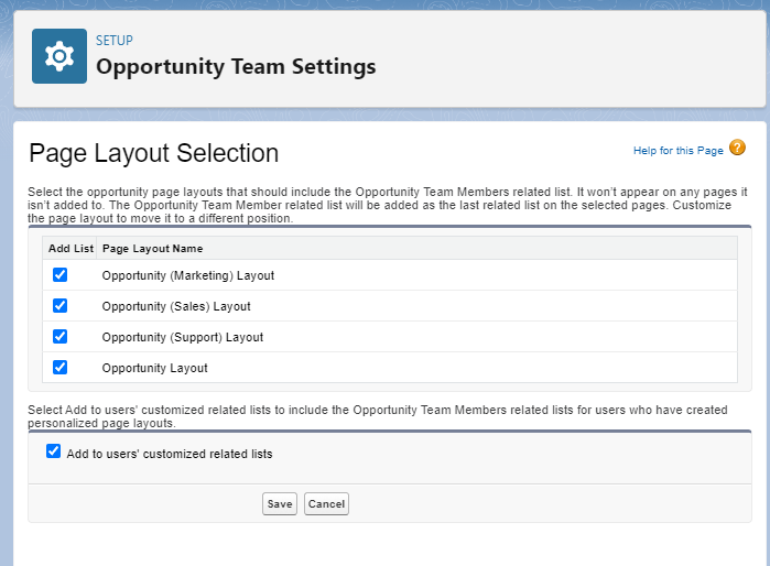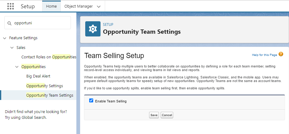 Quick Find에서 Opportunity Team Setting을 검색해서 위와 같이 활성화 할 수 있습니다.