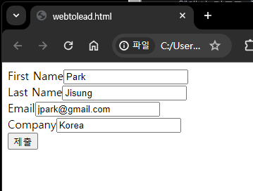 해당 HTML을 파일로 저장한 뒤 브라우저로 열어보면 선택한 필드와 제출버튼이 포함된 것을 볼 수 있습니다. 임의의 값을 입력하고 제출했습니다.