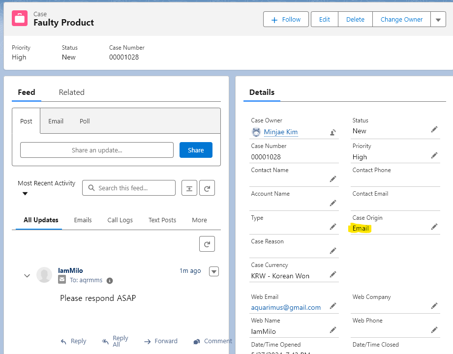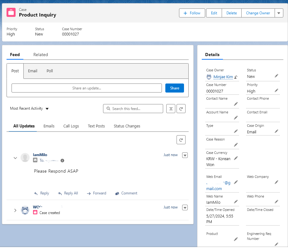레코드를 조회해보면 새로운 케이스 레코드가 생성되고 케이스 소유자가 지정한대로 할당된 것을 볼 수 있고 메일의 내용도 확인할 수 있습니다.