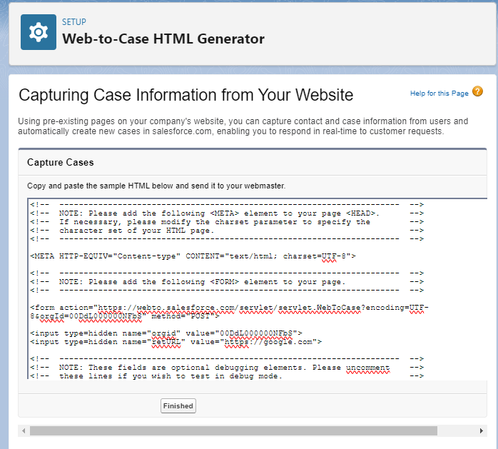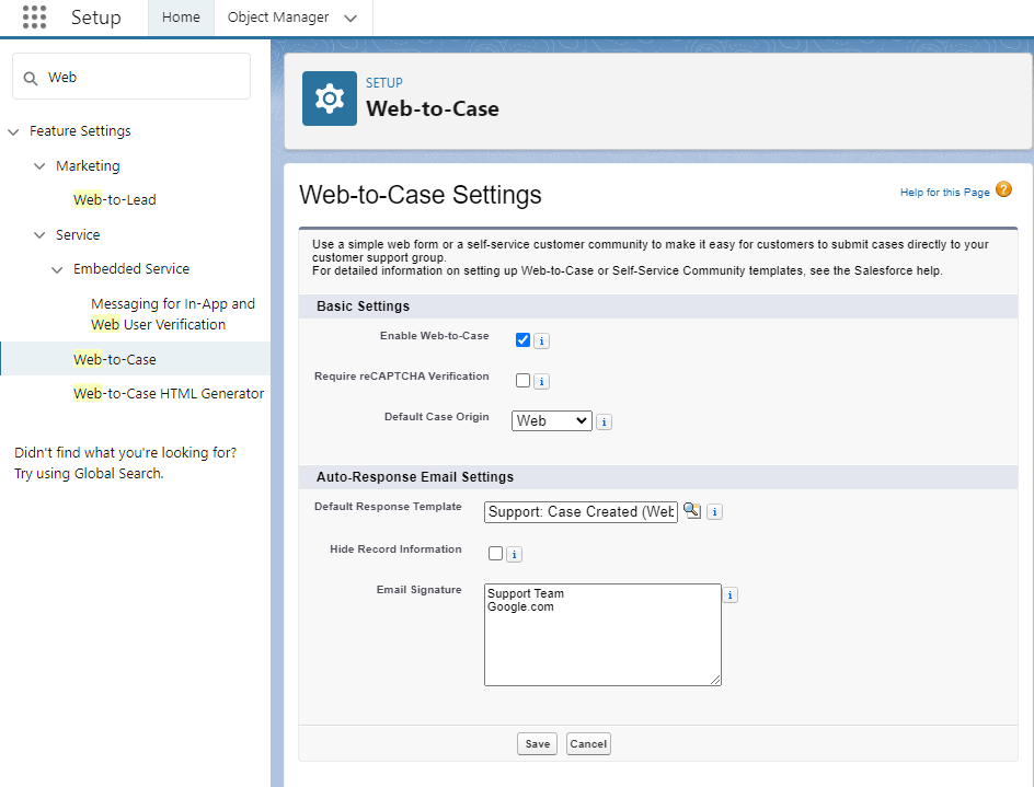Quick Find에서 Web-to-Case에 접근하여 위와 같이 활성화 할 수 있습니다. 생성되는 Case의 origin을 설정하거나 폼을 제출한 유저에게 전송할 디폴트 메일 템플릿 및 해당 메일의 서명 등을 설정할 수 있습니다.