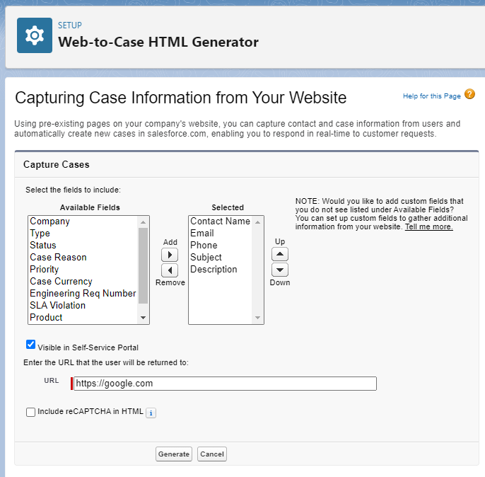 Web-to-Case HTML Generator에서는 위와 같이 수집하고자 하는 필드를 form에 포함하도록 선택할 수 있고, 유저가 폼을 제출한뒤 리다이렉트 될 URL을 지정할 수 있습니다.