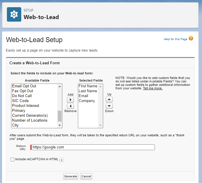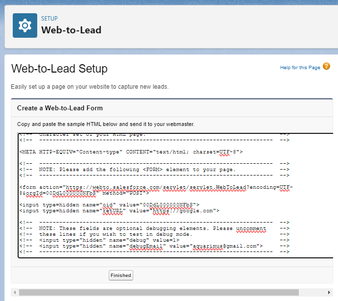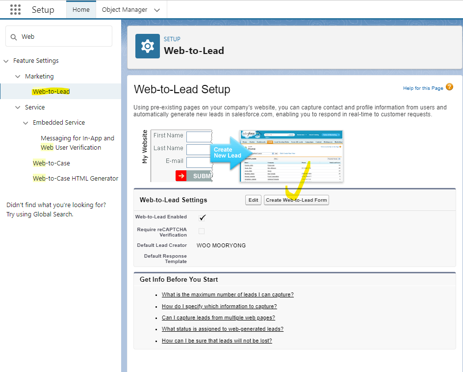 Quick Find에서 Web-to-Lead에 접근한뒤 Create Web-to-Lead버튼을 눌러 새로운 폼을 생성할 수 있습니다.