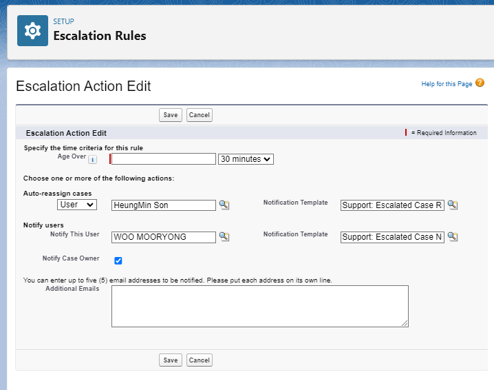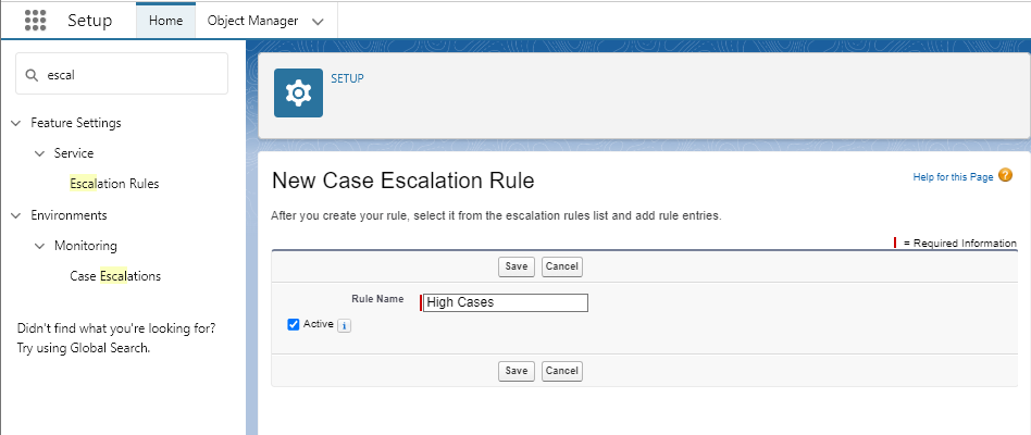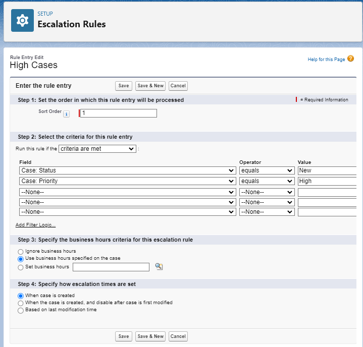 Quick Find에서 Escalation Rules에 접근한뒤 New 버튼을 눌러 새로운 규칙을 생성할 수 있습니다.