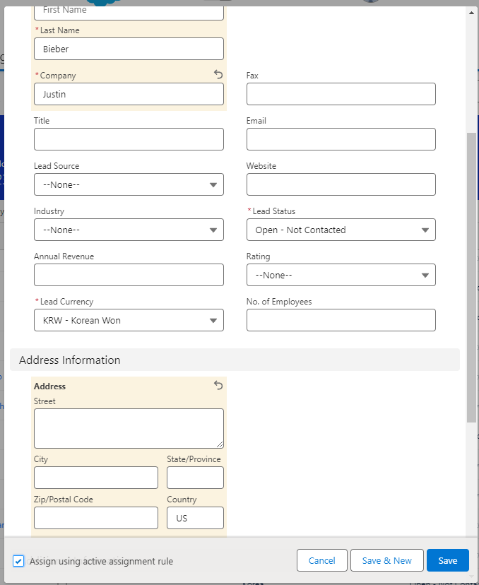 테스트를 위해 Country를 US로 기입하고 새로운 Lead 레코드를 생성했습니다. 저장시 Assign usign active assignment rule을 체크해야 룰이 적용됩니다.