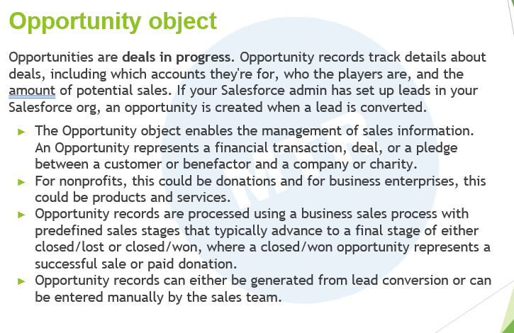 Opportunity 객체는 진행 중인 거래들을 나타냅니다. Opportunity 기록은 거래에 관한 세부 사항을 추적하며, 이는 거래가 어떤 Account(계정)을 위한 것인지, 관련된 인물들은 누구인지, 그리고 잠재적인 매출 금액은 얼마인지 등을 포함합니다. Salesforce 관리자가 여러분의 Salesforce Org(조직)에서 Lead(리드)를 설정했다면, Lead가 전환될 때 Opportunity가 생성됩니다.