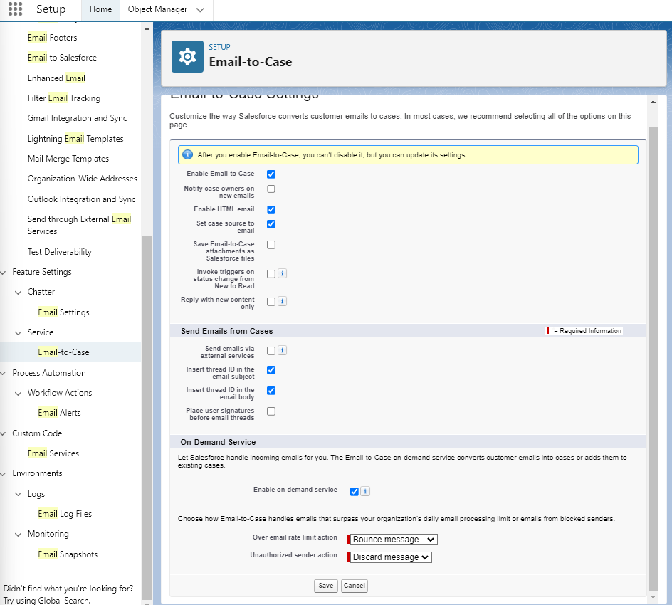 Quick Find에서 Email-to-Case에 접근해서 기능을 활성화 할 수 있습니다. Thread ID를 사용하게 함으로써 각 메일마다 새로운 쓰레드를 생성하지 않도록 설정할 수 있습니다.