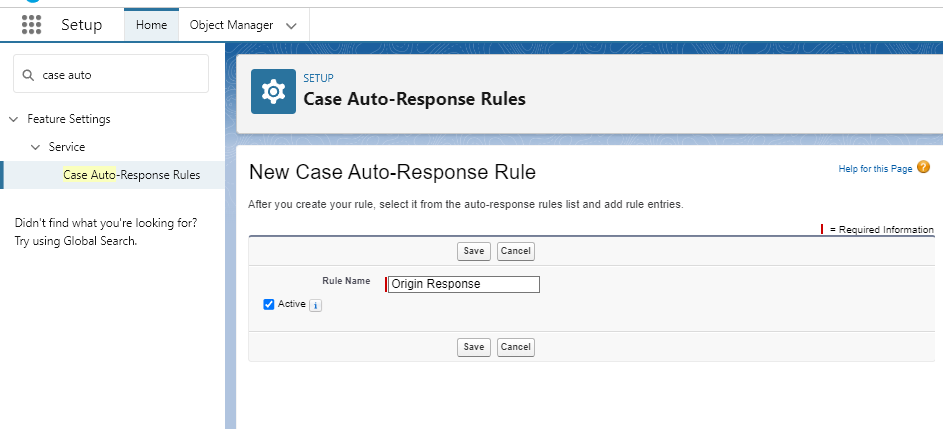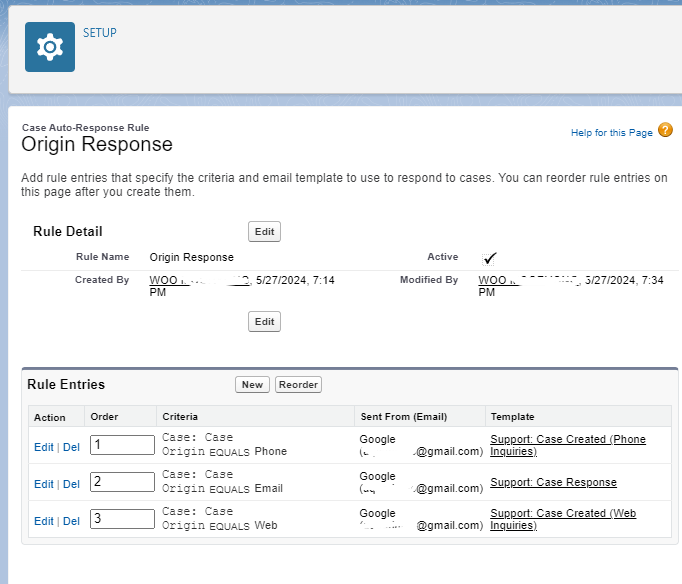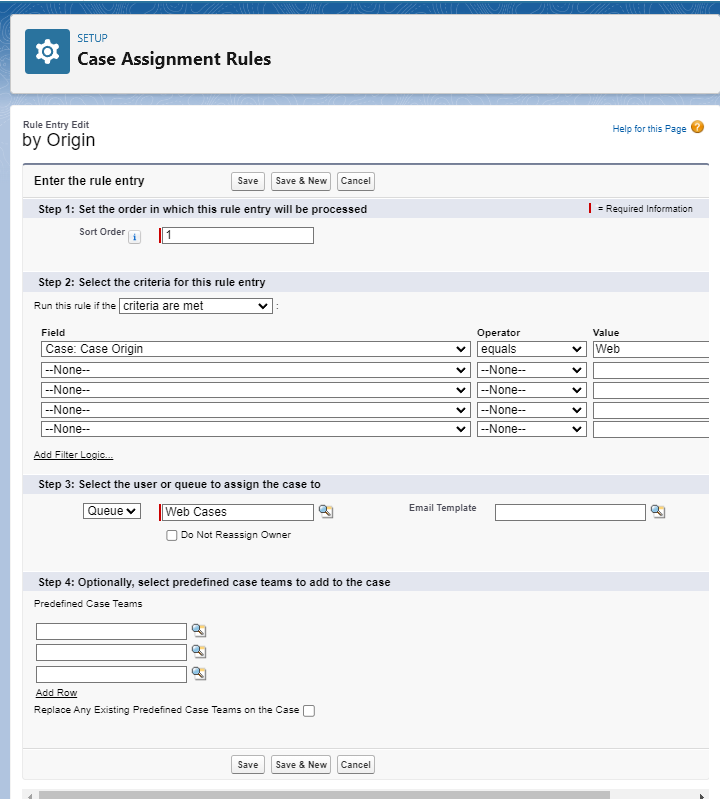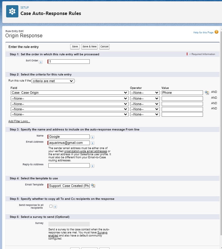 Quick Find에서 Case Auto-Response Rules에 접근한뒤 New 버튼을 눌러 위와 같이 새로운 규칙을 생성할 수 있습니다.
